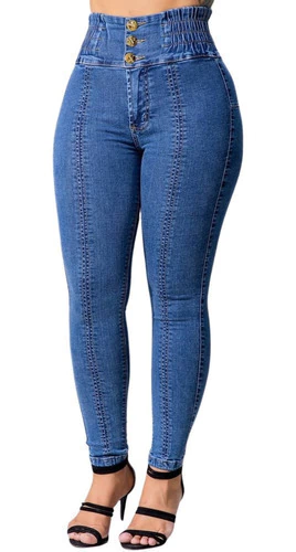 - Jeans modelador com cintura alta cobrindo o umbigo.