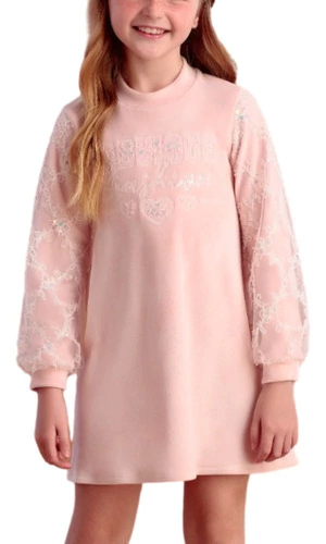 Vestido Rosa de Veludo e Manga Longa com Tule - Petit Cherie
